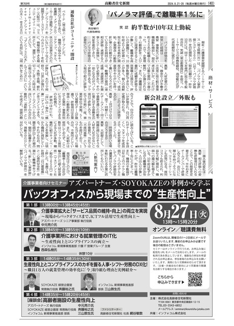 2024年9月10日号のシルバー産業新聞、ケアニュースにて、